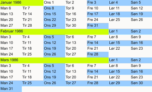 11 Fra søndag 19. januar til fredag 31. januar i 1986, ble livene våre forandret fra idyllisk til tragisk. Dette hadde en eneste årsak, det var på grunn av uvedkommende og inntrengere som ikke hadde hatt noe å gjøre med vår felles situasjon. Ingen som visste ordentlig om vår felles situasjon og ikke ønsket å skade oss, ville ha gjort noe tilsvarende som disse menneskene har gjort mot oss. Helt til søndag 19. januar 1986, hadde kontakten mellom datteren min og meg vært som det er vist i kalenderen i begynnelsen av denne teksten, der dagene som er merket med blått er dagene for samvær mellom datteren min og meg, fellesskapet vårt var noe selvsagt. Disse to siste ukene av januar 1986, ble etterpå noe jeg ikke kunne finne i hukommelsen min mer. Men i dag husker jeg detaljert hva som skjedde gjennom disse to ukene, og det er det jeg først og fremst ønsker å fokusere på i denne teksten. Det er noen riktige datoer for viktige hendelser som jeg har funnet ut, som har blitt nøkkelen til problemet for meg. I 1986, var det som hendte i løpet av disse to ukene uventet og utenkelig for meg, og det var også unødvendig. Hvis de som begynte å forårsake vanskeligheter for oss hadde latt det være, hadde situasjonen vår vært hyggelig og velordnet i løpet av januar 1986, og også gjennom årene etterpå.