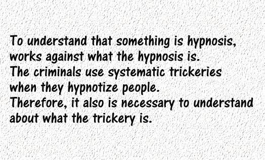 I have wondered about what all these different influences against me in the end should have been. I have thought about that I can’t understand exactly what the precisely goal is. Now I understand that the precisely goal never was done. The person who influenced me in 1975, didn’t finish the influence of me. Therefore, I don’t know exactly what the final and most important influence over me should have been. What that was; was something he didn’t do, because he thought I had fall asleep. I think that was because, that was the only thing he knew about, that it could be, which had happened to me. I think about that all the different influences against me, should have had a precisely and exact purpose. But what that was; was something which never was done. So when I don’t understand what that is, that is because it wasn’t done. I think there should have been defined a goal, with all the influences against me, as if I gradually should have approach the bull’s eye in the target. Before I had reached that goal, it maybe could have been that I could have moved in zigzag, spun round, went back and forth, etc. This is how I think it can be, that it was meant to be. But I don’t know what it should have been. It is impossible for me to find out more, about what the criminals have done against me. What they have done against me, is to trick me. The criminals haven’t informed me about what they are doing; therefor I don’t know that. I only know a few things. For me, the knowledge about what the criminals are doing, explains what goes on in the world today. I think that others also can get the same understanding; that the knowledge of what the criminals are doing, explains what goes on in the world today. ▪ When I lay and listened to what the criminals were talking about, when they thought that I was sleeping in 1975, I thought: “They are talking about wars. They make wars. This is something no one knows about. They are doing something terrible.” This is something important. I got a clear impression of that these wars were important for them. They influence all others to fight against one another, to win their own war in that way. Their own situation is that they relax, and sit and watch how they have got all to fight against one another. I think they are attacking the development of the knowledge and understanding of humankind. The knowledge I think about, is the knowledge that has to do with the humans and our societies. The development of the knowledge on this field, developed simultaneously with the development of the knowledges on all other fields. It was a situation from 1900, which started before that time, which as a whole, developed our knowledge on all fields. This is that the criminals are attacking the humankind. That is that they want to have the power over humankind. It is possible to understand; that how the criminals want to have the power over the humankind, that is nothing else than a very serious crime. It is possible to understand that everything they do is wrong; every single thing of it, and the whole of it. The criminals make wars where all the parties to the dispute are their enemies. The criminals are all the parties’ hidden enemy. The criminals have developed a method there they influence us all, to make all kinds of conflicts, because they want to win against us all. I think the criminals don’t care about me, and don’t think about me any longer. It is now 41 years since this was done against me. I think, that they think, that I only have become more and more ruined. The influence of me failed. I think they don’t want to think about that. I think they want to care about other things, which they succeed in doing. ▪ It is necessary to unmask these criminals. They are passive. They don’t fight against us with weapons. They influence us to fight against one another with weapons. Therefore, this is a passive and dangerous enemy. It is necessary to find out about them; that is what it is, which is dangerous for them. These criminals don’t attack us with ordinary weapons. They are doing something else; which we must find out about, understand, and do something about in a sensible way. These criminals aren’t a country or a known branch of government. They are only some people we don’t know about what are doing. Because the criminals have hidden goals behind what they have influenced us all to do, in different ways; it is necessary for us to stop doing what these criminals have influenced us to do. We must begin to find out about them, instead of doing what they want. They have tricked us all, that is the truth. Their influences are also extremely powerful, that is also the truth. When we know about them, then it is possible for us to begin to trick them. At the same time, it is important that we stop doing all the wrong things, which they want us to do. One of their trickeries is, that they have influenced us to believe, that what they have influenced us to do, is correct to do. That trickery is based on; that we lack enough knowledge, and don’t know, that what we think we know, is something wrong. The criminals have influenced us all to do wrong in different ways. I think that what has happened with me, can happen with all the humans in the world; that all get a counter‐reaction against these influences of oneself. This counter‐reaction will become stronger and stronger, after it has started. Before we know something, this counter‐reaction is nothing. After we know something, this counter‐reaction will be more and more. We are not enemies; we have only been victims of what the criminals are doing. We have only been victims of something we haven’t known. When the criminals know something about us, which we don’t know; then they can say to one another, that we are stupid. When we know something about the criminals, which they don’t know; then we can say to one another, that they are stupid. The best will be, that all the diffe