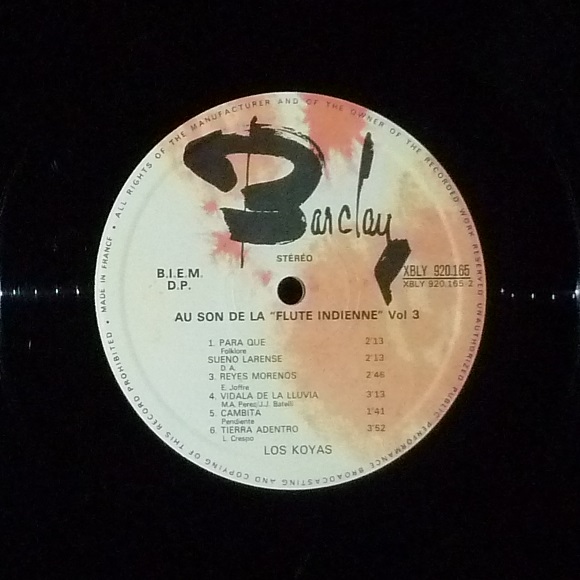 Los Koyas Au Son De La Flute Indienne Vol. 3 The 'Los Koyas' folk music group: In the Inca Kingdom the name of 'Koya' was given to the Princesses of Royal Blood. In Bolivia there still lives a race of 'Colla' or 'Koya' Indians. On this record the 'Koyas' transmitt to us all the mystery and magic of Indian music. (Barclay 920 165 – Made In France – Circa 1970) |