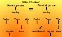 Her avslutter jeg denne oppsummeringen. Dette er sterke elementer av denne delen. Jeg vil ikke ødelegge det med å bringe inn fler antakelser om det i dag. Men de siste dagene har jeg opplevd at dette kan være en av nøkkelfaktorene i denne situasjonen. Den sterke opplevelsen angående denne kniven, påvirket meg til å lage et skjematisk bilde om denne påvirkningen inni meg. En normal person til venstre, og en påvirket person til høyre. "Meg selv" får sin påvirkning av meg. "Andre" påvirker meg fra utsiden av meg. "Mental kontroll" er blitt lurt inn i meg, uten at jeg vet det. Disse tingene i bunnen; påvirker mine "følelser", "tanker" og "vilje". Alt dette påvirker hvordan jeg "handler". Normale og påvirkede personer kan påvirke hverandre begge veier. Men påvirkede personer her noe spesielt inne dem selv, som det er viktig å finne ut om og forså om. Jeg tenker at riktig forståelse om disse tingene kan hjelpe veldig mye, kanskje også fullstendig.