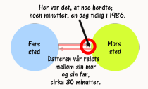 Dette er ikke årsaken til situasjonen som utviklet seg. Denne situasjonen har en litt komplisert forklaring, som er under veis på dette nettstedet. Dette bildet er bare en klargjøring av hvordan det startet i 1986. Ettersom andre personer ble involvert, gjorde de så mye ulovlig og galt; at de mer og mer ikke ønsket en etterforsking og oppklaring. De begynte å beskytte seg selv mot at situasjonen ble oppklart. Men dette er også bare en medvirkende faktor. Den virkelige årsaken til denne situasjonen, er det som er blitt gjort i mot meg i 1976. Og å oppklare det, er vanskelig. Det som er vanskelig, er kanskje ikke å forstå det, men å finne ut om det, fordi det er så sterkt skjult. Dette er også under veis på dette nettstedet. Det er ikke fullstendig umulig for meg å forså noe mer, det er mulig for meg å forstå litt av det. ▬ Onsdag 28. august 2013 Den avgjørende faktoren i denne sammenhengen, er den skjulte mentale påvirkningen jeg er blitt utsatt for i 1976. Men forskjellige ting som hendte i 1986, er den katastrofale ødeleggelsen for de berørte personene, som etter hvert ble mange. Her skal jeg nevne noen få stikkord om det, så det er mulig å få en kortfattet forståelse av det. Det spesielle her, er hvordan det skjedde så mye galt. Dette er bare en enkel skisse av situasjonen; denne situasjonen hadde utviklet seg i 12 år i 1986, og inneholder mye mer. En full fremstilling om dette, inneholder mye mer. Utenforstående som involverte seg i denne situasjonen; har gjort mer grusomt enn de kan forstå, mot fler mennesker enn de vet hvem er. Til jul og påske vekslet vi mellom at datteren vår var sammen med sin mors familie og sin fars familie annethvert år. Begge familiene bodde et annet sted i landet, og ikke i Oslo hvor vi bodde. I 1985 var hun sammen med sin mors familie. Og planen var at hun etterpå skulle være sammen men sin fares familie til påske i 1986. Før denne julen, hadde jeg en følelse av at noe var galt. Jeg snakket med hennes mor om at vi alle kunne møtes og være sammen hos henne etter jul, på fredag 3. januar. Hun var ening i det. Hver julaften, snakket datteren vår med den andre forelderen i telefonen. Da jeg snakket med datteren vår i telefonen denne gangen, hørtes det ut som om hun var i en begravelse. Etterpå sa jeg til familien min, at det hørtes ut som om det var noe galt. Men jeg måtte finne ut om det, da jeg kom hjem, sa jeg. Da jeg kom til datteren vår og moren hennes, fredag 3. januar. Hadde jeg tenkt på at det var noe galt, hele juleferien. Da jeg snakket om det til moren hennes, svarte hun at ikke noe var galt. Jeg hadde blitt usikker. Og da vi snakket om hva vi skulle gjøre, sa jeg at datteren vår kunne bestemme; om vi skulle var sammen der, eller om hun skulle reise sammen med meg til der jeg bodde. Hun svarte øyeblikkelig at hun ville reise til meg, hun var blitt redd for noe med sin mors familie. På grunn av dette, ble moren hennes forvirret og lei seg; men jeg reagerte på grunn av hvordan datteren vår hadde snakket i telefonen og hvordan hun så bestemt ønsket å reise til meg. Det var som om hun var blitt redd for at hun ikke skulle få være sammen med meg mer. Hjemme hos meg, sa datteren vår til meg at hennes mors familie hadde snakket om, at hun ikke skulle være sammen med meg. Jeg beroliget datteren vår, og sa at det var umulig for dem å gjøre det, fordi det er ulovlig å hindre henne i å være sammen med faren sin, sa jeg. Jeg sa også at jeg tidligere hadde snakket med en person, som på den tiden arbeidet på politistasjonen i nærheten av der hun bodde, og jeg kunne snakke med ham, om familien til moren hennes begynte å lage problemer, sa jeg. Jeg hadde snakket med ham da jeg arbeidet på en ungdomsklubb i 1983. Datteren min ble glad, og vi hadde en hyggelig helg sammen. Onsdag 15. januar 1986, gikk jeg til doktoren. Jeg hadde vært hos denne doktoren et halvt år tidligere med reumatisme. Denne gangen fortalte jeg doktoren at behandlingen ikke hadde virket, og at jeg var syk igjen. Jeg sa også at det var vanskeligheter i min livssituasjon, og at disse vanskelighetene ble problematiske sammen med de reumatiske plagene. Jeg ble litt sjokkert da doktoren svarte, at jeg var deprimert, og så skrev ut en sykemelding for depresjon. Jeg tenker nå at denne doktoren kanskje hadde hatt mange sånne pasienter, som ikke hadde blitt bra igjen av hennes behandling. Men på den tiden hadde jeg ingen tanker om det. Onsdag 15. januar besøkte jeg også datteren min og moren hennes. Moren hennes sa at hun ville, at jeg skulle komme til dem og være mer samen med barnet vårt. Nå tenker jeg at det var fordi hun hadde snakket med datteren vår om situasjonen med hennes kontakt med sin mor og far, og at moren hennes ønsket å gjøre noe for å få datteren vår til å bli glad. Moren hennes og jeg ønsket alltid at datteren vår skulle ha god kontakt med den andre forelderen. Fredag 17. januar til søndag 19. januar, var datteren min og jeg sammen hjemme hos meg. Midt på dagen på søndag, ringte moren hennes på telefonen og sa at familien hennes var der, og spurte om hun kunne komme og hente datteren vår tidligere på grunn av det. Jeg spurte datteren vår, hun svarte bestemt nei. Moren hennes ble trist. Da sa jeg, at jeg kunne spørre datteren vår om hun kunne komme til moren sin tidligere om hun kunne være mer sammen med meg en annen gang. Jeg sa det til datteren vår, på en måte der jeg oppfordret henne til å gjøre som moren hennes ønsket. Datteren vår sa da, at om det var sånn, at hun skulle være mer sammen med meg en annen gang, så var det greit. Men hun var veldig bestemt med det. Og jeg sa til moren hennes, at datteren vår nå hadde hørt avtalen, og at vi måtte følge den opp, hun svarte ja. Moren hennes kom, vi satt og snakket en stund, og jeg tenker vi hadde laget noe å spise og drikke; etter det, fulgte jeg dem til T–banestasjonen. På mandag ringte jeg moren hennes, for å 