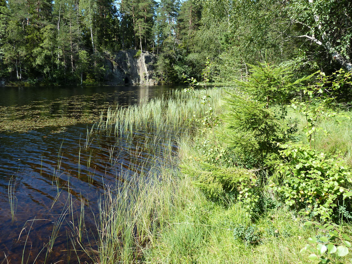 North‐west Kroktjern (Hook Lake). The black cave by the water's edge in the middle of the image, is a man‐made tunnel. It is 164 yards long. It is called Kroktjerntunnelen (The Hook Lake Tunnel). A brook runs out from the other end. This tunnel was made in 1947 to increase the water feed to Lutvann (Lut Lake). Lutvann was drinking water for Oslo from 1918 to 1977, among other drinking water resources. It is no knowledge about the name Lutvann. Lutvann has from a long time ago been understood as very clean water. Today Lutvann is reserve drinking water supply. Thursday, August 13, 2015. www.davidhegg.org |